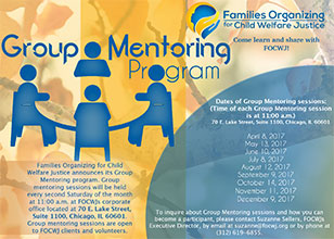 Families Organizing for Child Welfare Justice announces its Group Mentoring program. Group mentoring sessions will be held every second Saturday of the month. Group mentoring sessions are open to FOCWJ clients and volunteers.